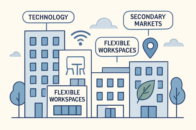 - Adaptive reuse and flexible workspaces are reshaping demand for traditional office spaces.